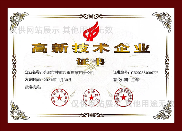 合肥神雕起重是高新技術企業(yè),是安徽省科創(chuàng)板掛牌企業(yè)(證券代碼:630331),同時榮獲安徽市場質量、誠信五星級企業(yè)、合肥經濟圈示范企業(yè)、合肥市創(chuàng)新型企業(yè)、安徽省市場質量放心產品等榮譽稱號